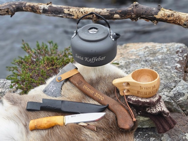 Gavepakke Aktiv - unikt utformet starter pakke for alle ungdoms-gutter som er glad i friluft. Kaffekanne til bål (kan også brukes for supper, kakao++), Turkopp med eget navn, en god turkniv av beste kvalitet og en turøks som er fin å ta med i sekken. Godt utformet som gavepakke til konfirmant gutt.