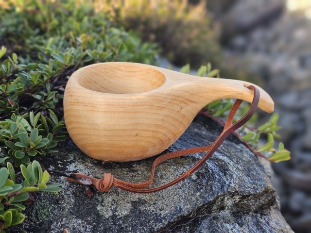 Eksklusiv håndlaget trekopp av Nordisk løvtre. Håndtak for 2-finger grep, ca 7,5 cm i diameter. Utmerket å gravere på !