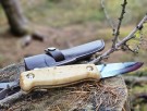 Unik og solid kniv. Et elegant bjørkeskaft som gir en naturlig og behagelig følelse i hånden, og en velutformet slire i mørkt lær. Sliren har også et praktisk trykkfeste som sikrer at kniven alltid ligger trygt i sliren. Hempe for feste i belte eller sekk gjør at den alltid kan være lett tilgjengelig.